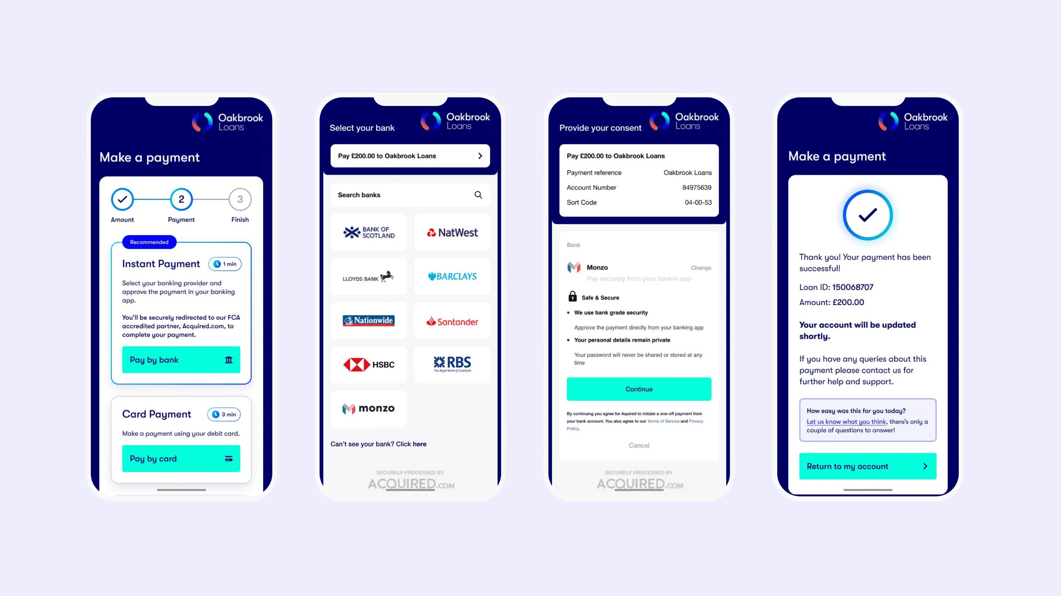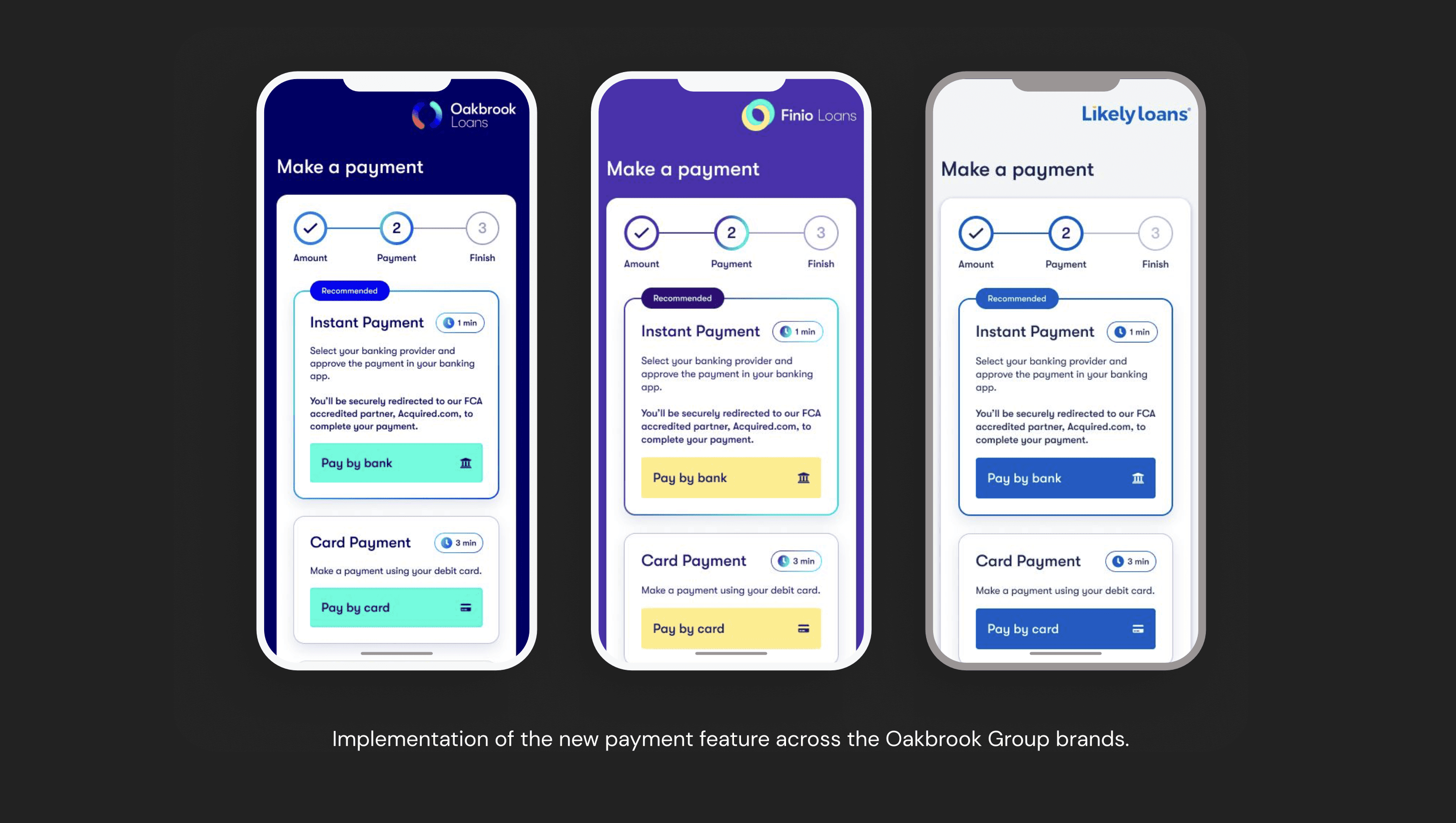 Designing a Pay by Bank journey for Oakbrook Finance that increased one-off loan repayments by 18% and cut support tickets by 12%.